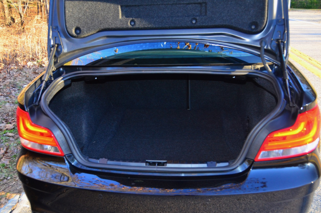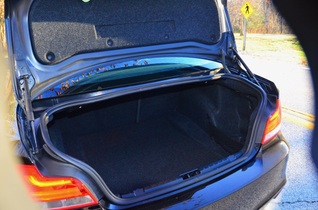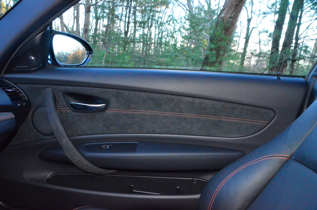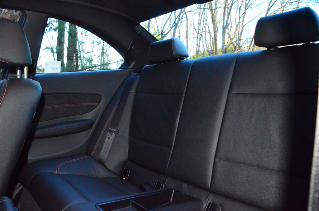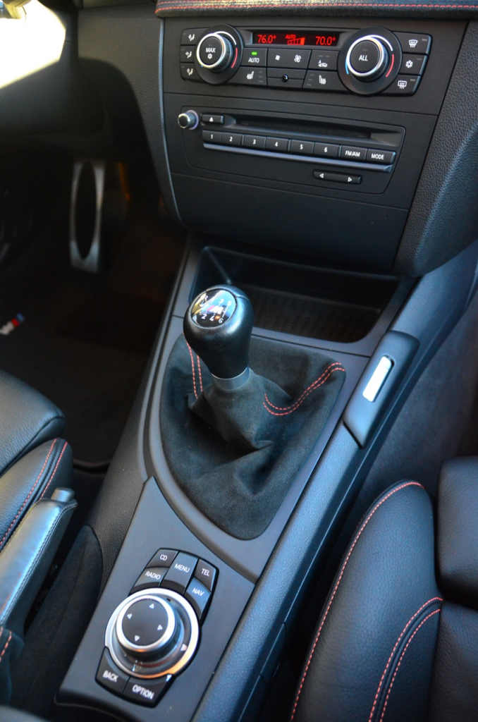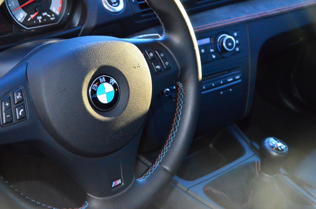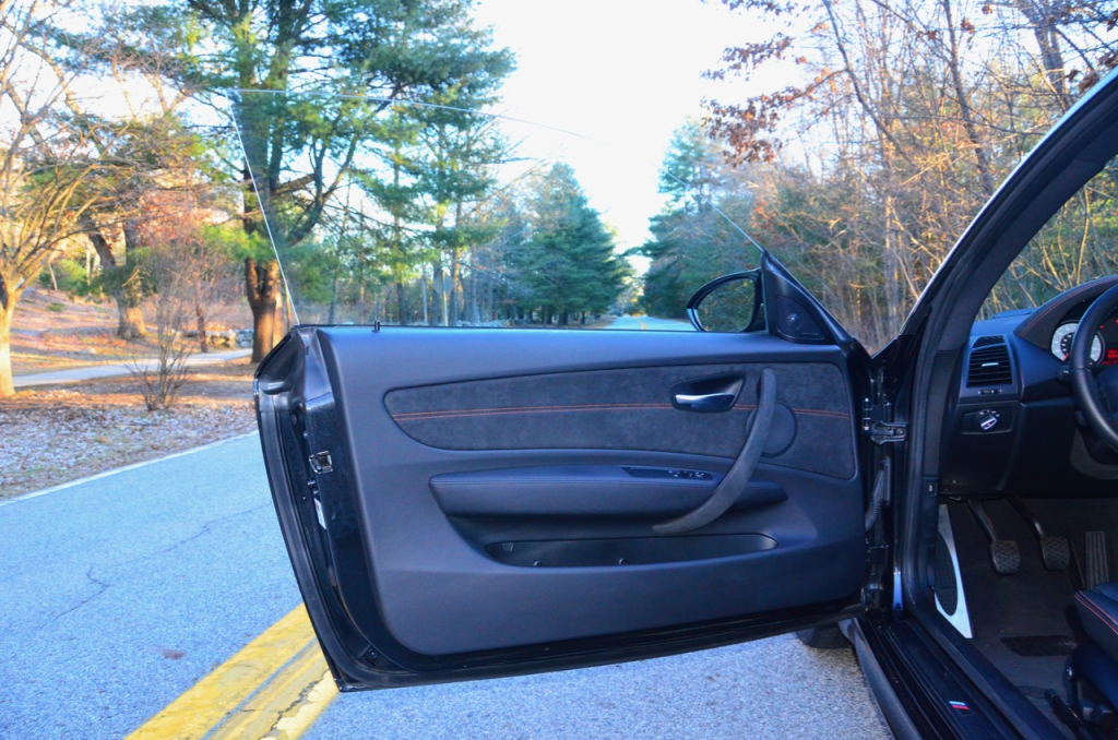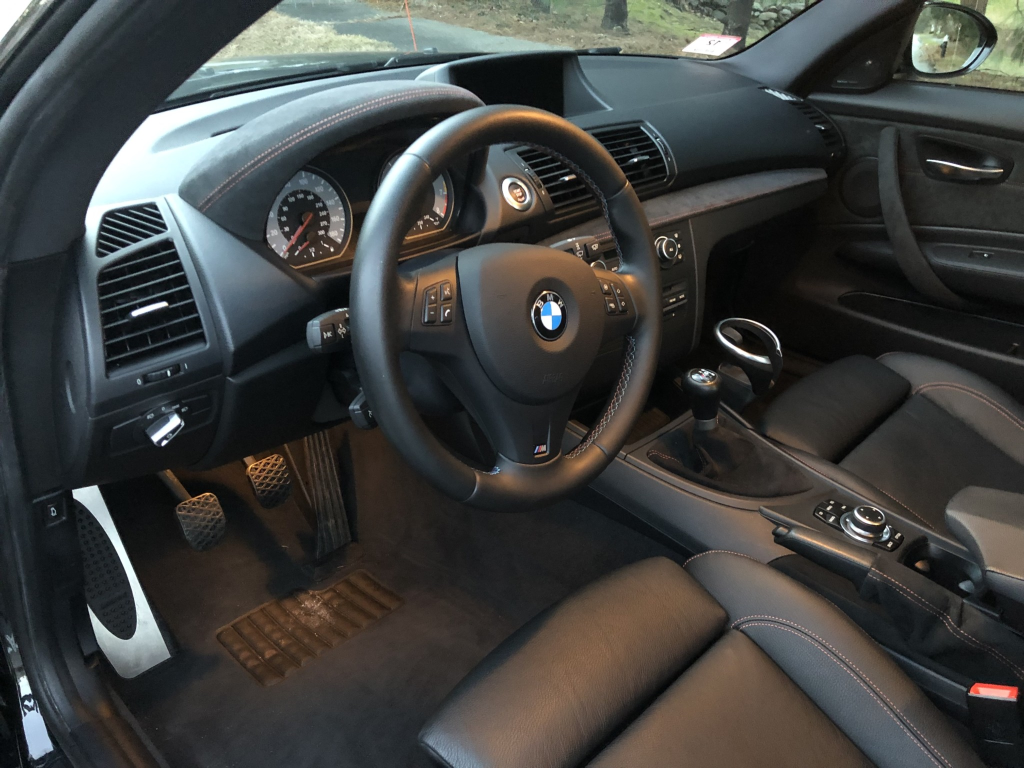 The interior is trimmed in black Boston leather with deviated orange stitching and Alcantara accents on the door panels, emergency brake and shifter boots, dashboard, and instrument binnacle. An Anthracite headliner is also fitted, and the 1M was not offered with a sunroof. This car is optioned with the Convenience Package (alarm system, keyless entry, rear parking sensors), Premium Package 2 (auto-dimming mirrors, power front seats, lumbar support, ambiance lighting), heated front seats, a Harman/Kardon sound system, satellite radio, and BMW Apps.