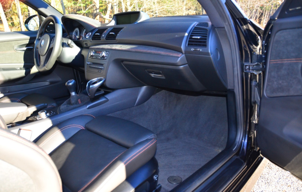 The 1M is distinguished from the standard 1-Series with flared fenders, unique bumpers and side skirts, a quad-exit exhaust system, M3-style side-view mirrors, and Shadowline trim. It also utilizes the brakes, limited-slip differential, aluminum dampers, rear subframe, and suspension components from the contemporary M3. As shown in the gallery, exterior blemishes include a ding in the belt line below the driver’s quarter window and a few scrapes on the low front bumper. The included Carfax is free of prior accidents or other damage.