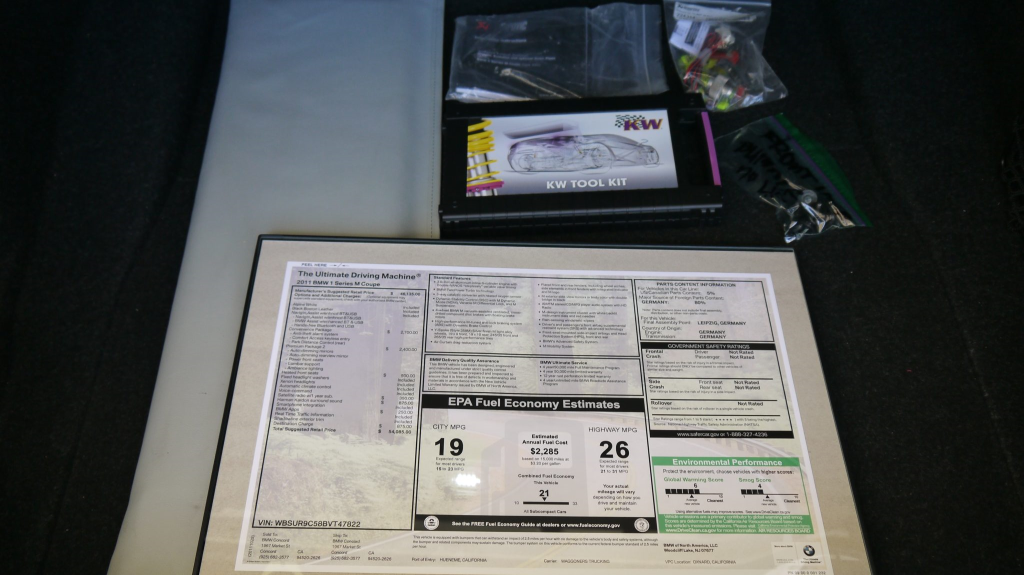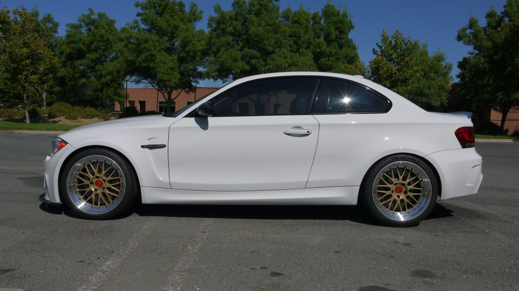 This 2011 BMW 1M is one of 983 cars delivered to North America during the model’s single-year production run. Finished in Alpine White III over black Boston leather, it is powered by a twin-turbocharged 3.0L inline-six linked with a six-speed manual transmission and a limited-slip differential. Modifications include an ETS intercooler and charge pipe, an Akrapovic exhaust, KW V3 coilovers, Ground Control camber plates, aftermarket sway bars, front and rear Brembo GT big brake kits, 19″ BBS LM alloy wheels, a Scorpp carbon-fiber front lip, an M Performance rear spoiler and mirror caps, Blackline taillights, and an Awron digital vent-gauge. The car is further equipped with the Convenience and Premium 2 packages as well as xenon headlights, rear Park Distance Control, heated power-adjustable front sport seats, dual-zone automatic climate control, a CD stereo, navigation, and iDrive infotainment linked to a Harman Kardon sound system. Acquired by the seller in 2024, this 1M has 18k miles and is offered with a window sticker, a KW tool kit, a clean Carfax report, and a California title.