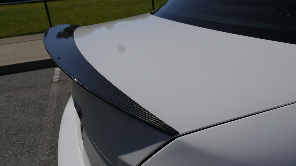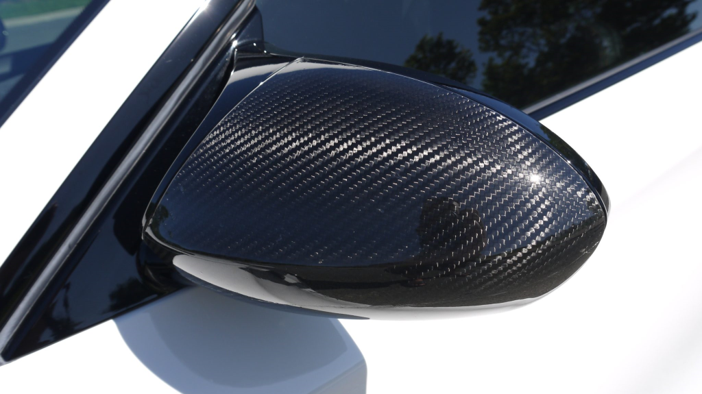 The car is finished in Alpine White III (300) and features model-specific bumper covers, side skirts, flared fenders, and quad exhaust outlets. Additional details include a Scorpp carbon-fiber front lip, M Performance carbon-fiber mirror caps, xenon headlights, IND black-finished side marker lights, rain-sensing wipers, auto-dimming side mirrors, an M Performance high-kick carbon-fiber rear spoiler, Blackline LED taillights, and rear parking sensors. The seller tells us that paint protection film is applied to the front clip, and the painted surfaces were recently ceramic coated.