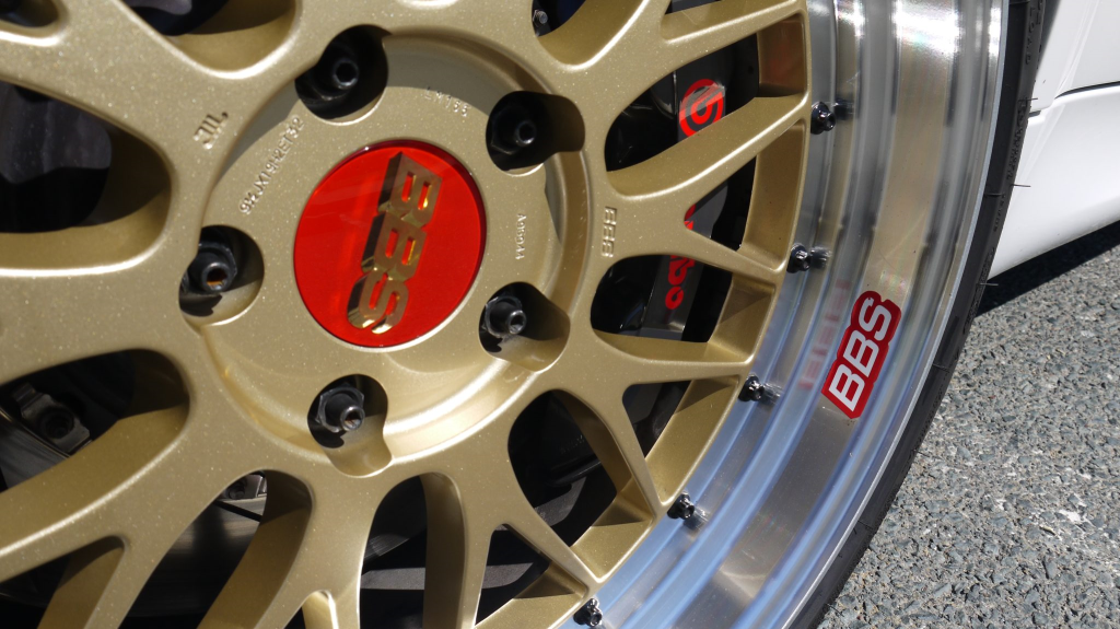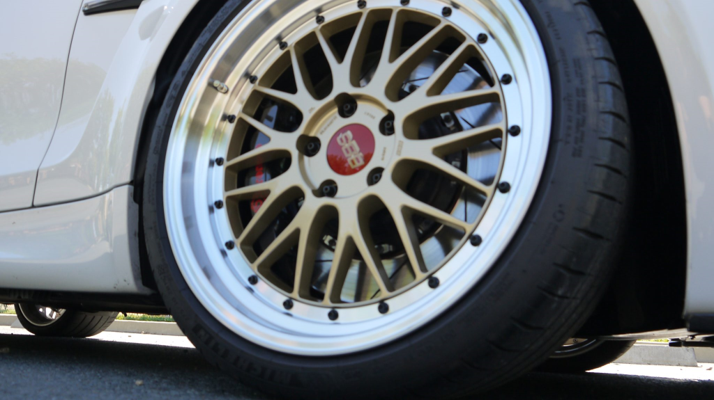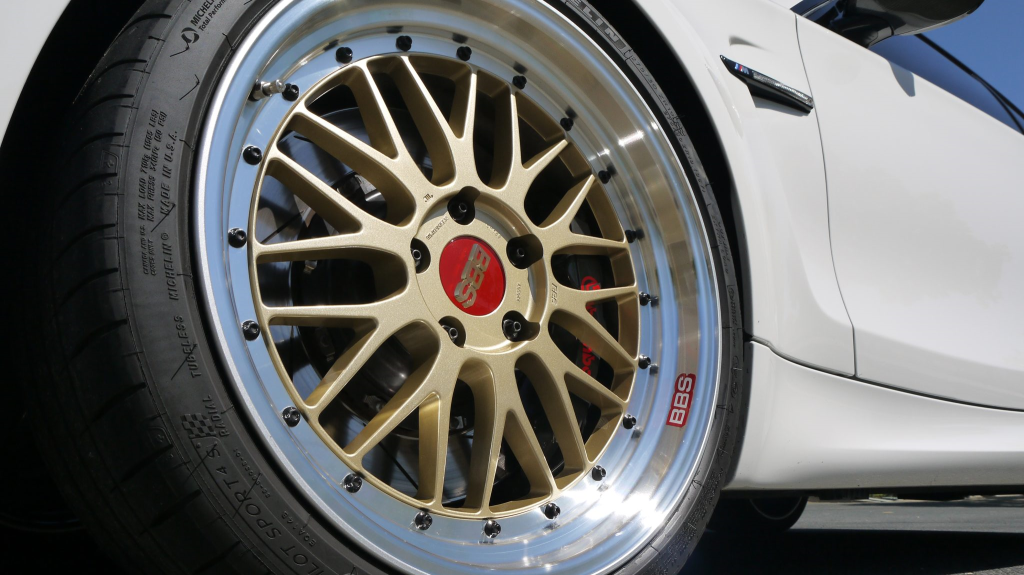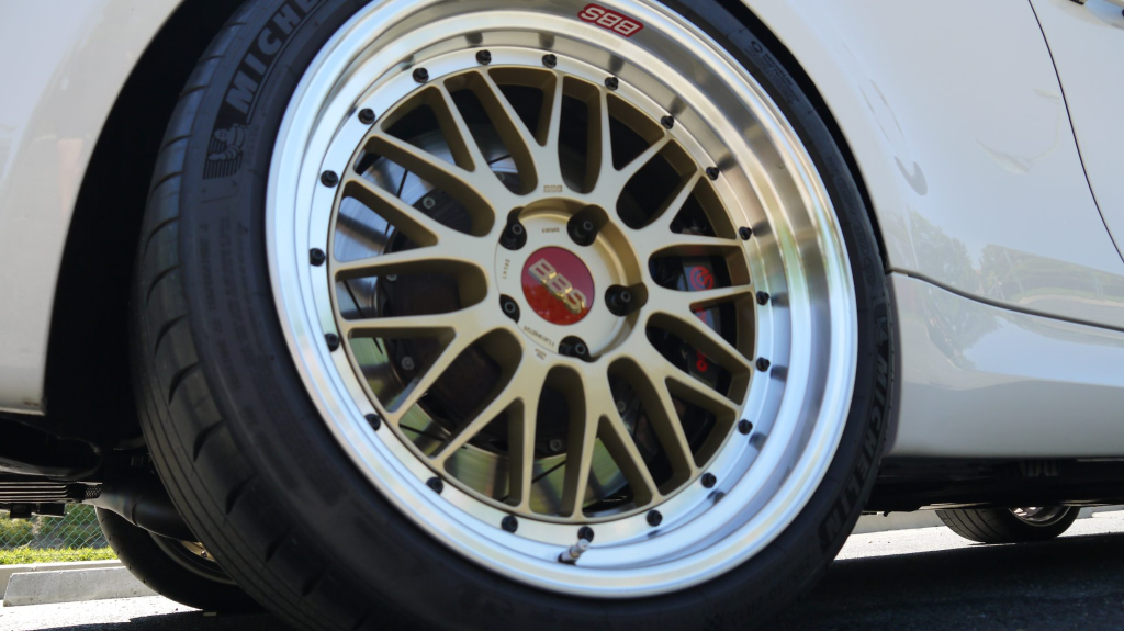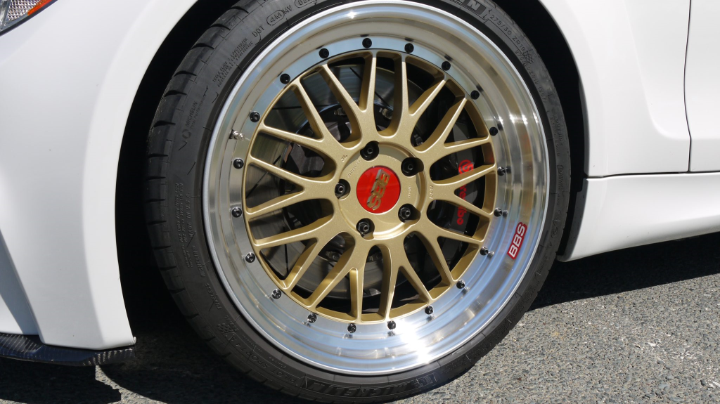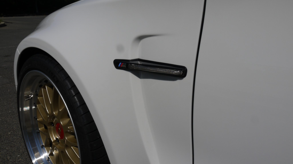 The 19″ BBS LM wheels with gold centers and polished lips are mounted with Michelin Pilot Sport 4S tires and feature 12mm spacers on the front axle. The car is equipped with Dynamic Stability Control (DSC) with M Dynamic Mode (MDM) as well as Dynamic Brake Control, and the suspension is modified with KW V3 coilovers, Ground Control camber plates, and aftermarket front and rear swaybars. Braking is handled by front and rear Brembo GT 380mm big brake kits featuring gray-finished calipers over slotted and floating rotors.
