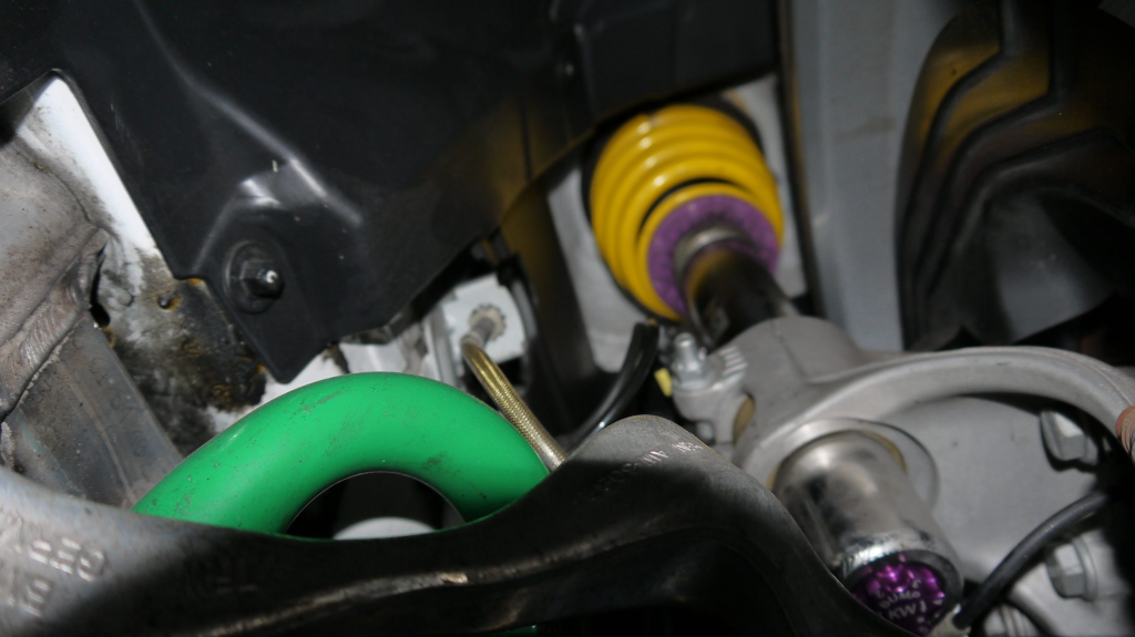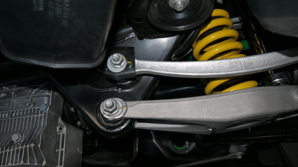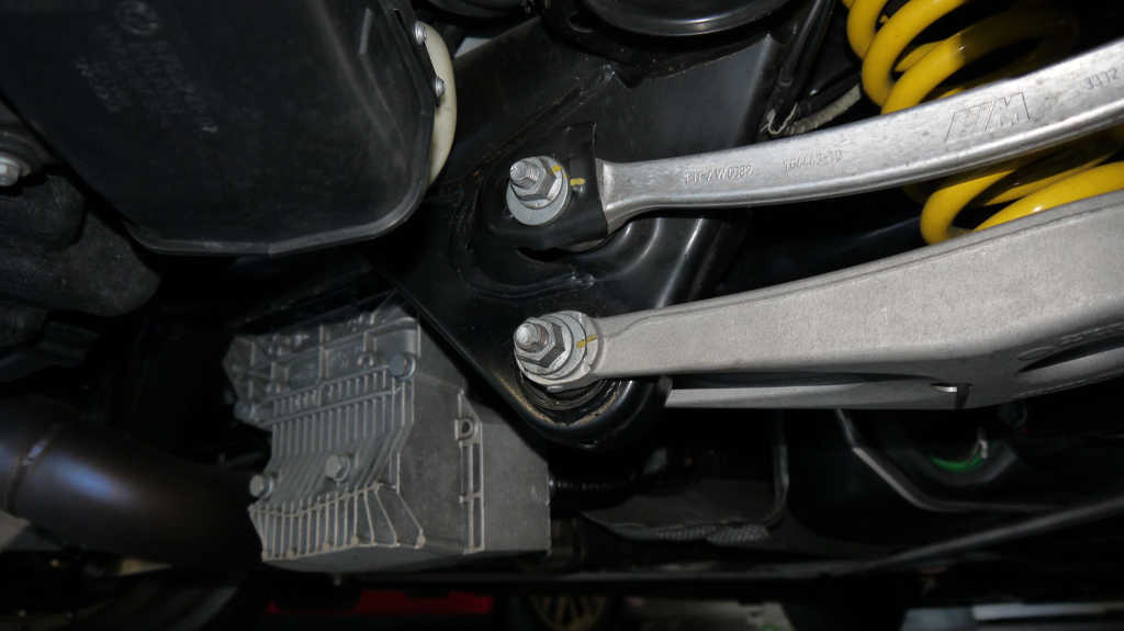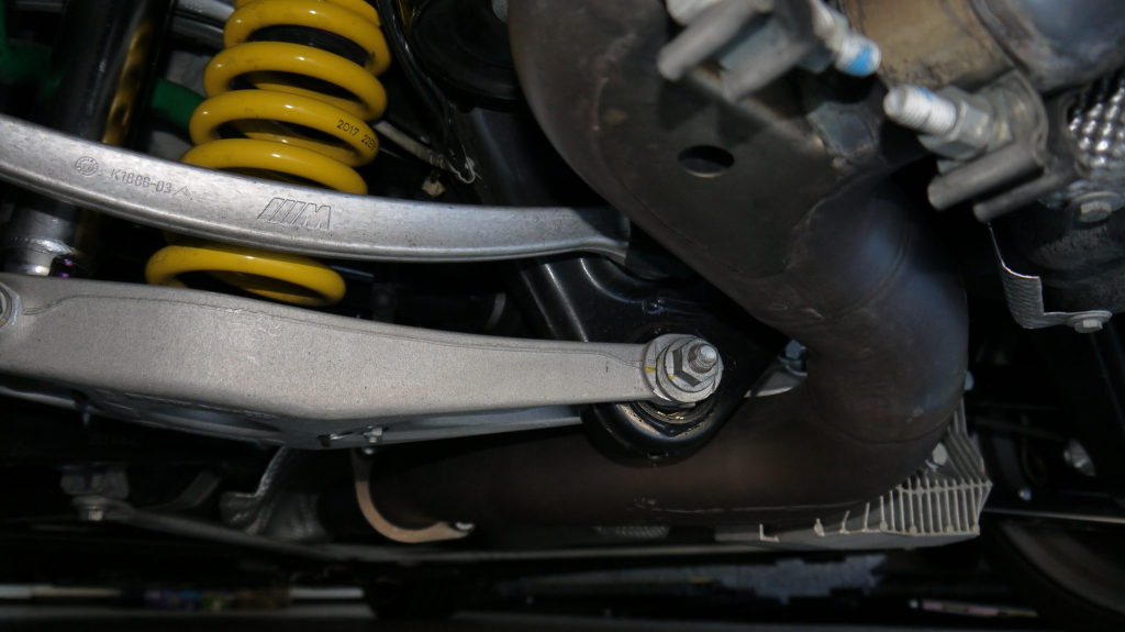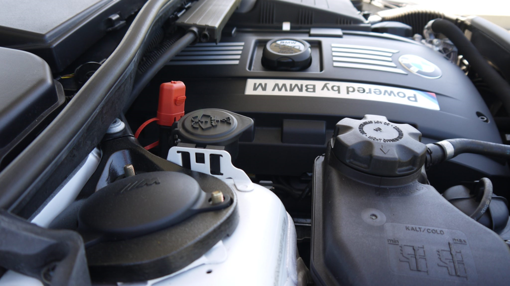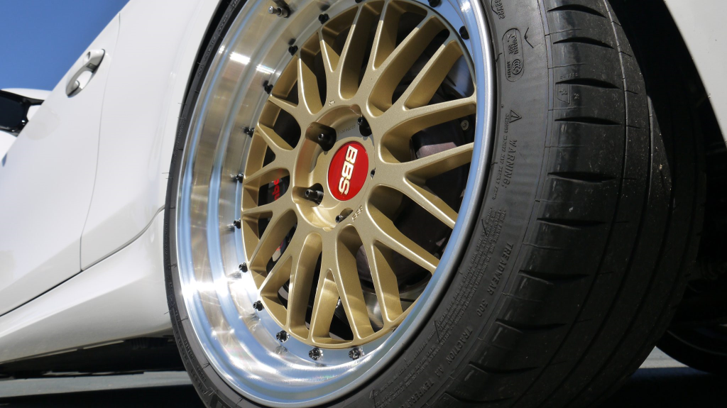 The 19″ BBS LM wheels with gold centers and polished lips are mounted with Michelin Pilot Sport 4S tires and feature 12mm spacers on the front axle. The car is equipped with Dynamic Stability Control (DSC) with M Dynamic Mode (MDM) as well as Dynamic Brake Control, and the suspension is modified with KW V3 coilovers, Ground Control camber plates, and aftermarket front and rear swaybars. Braking is handled by front and rear Brembo GT 380mm big brake kits featuring gray-finished calipers over slotted and floating rotors.