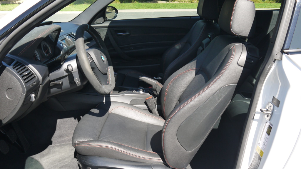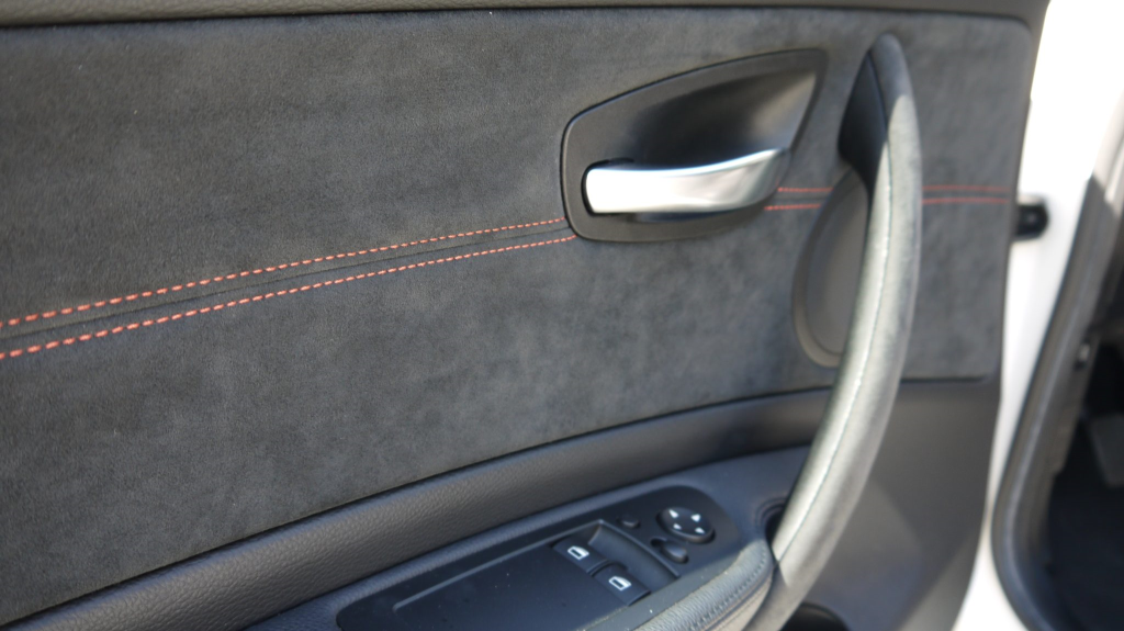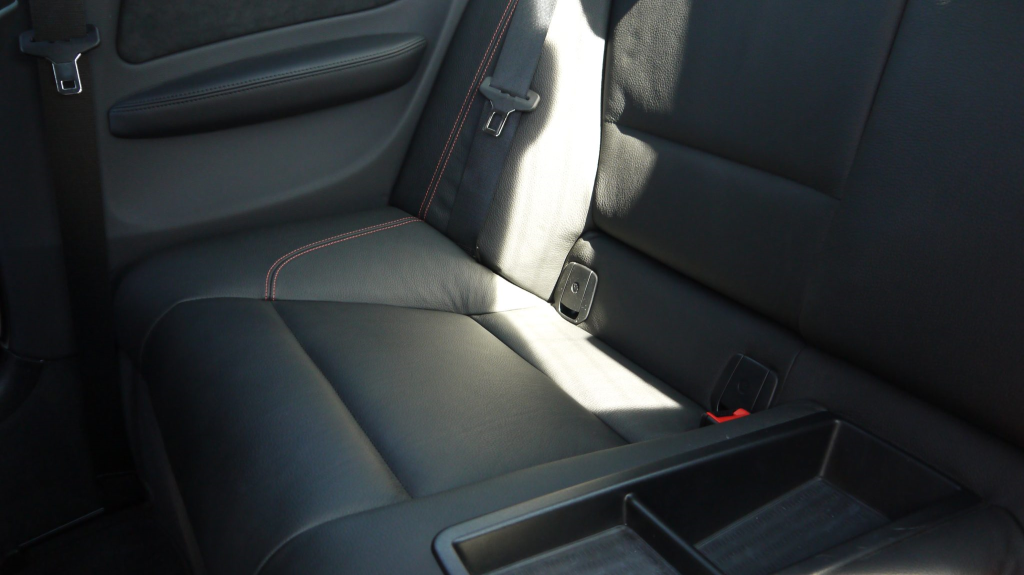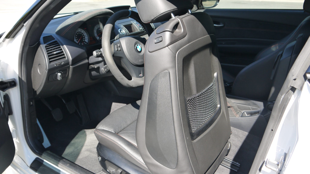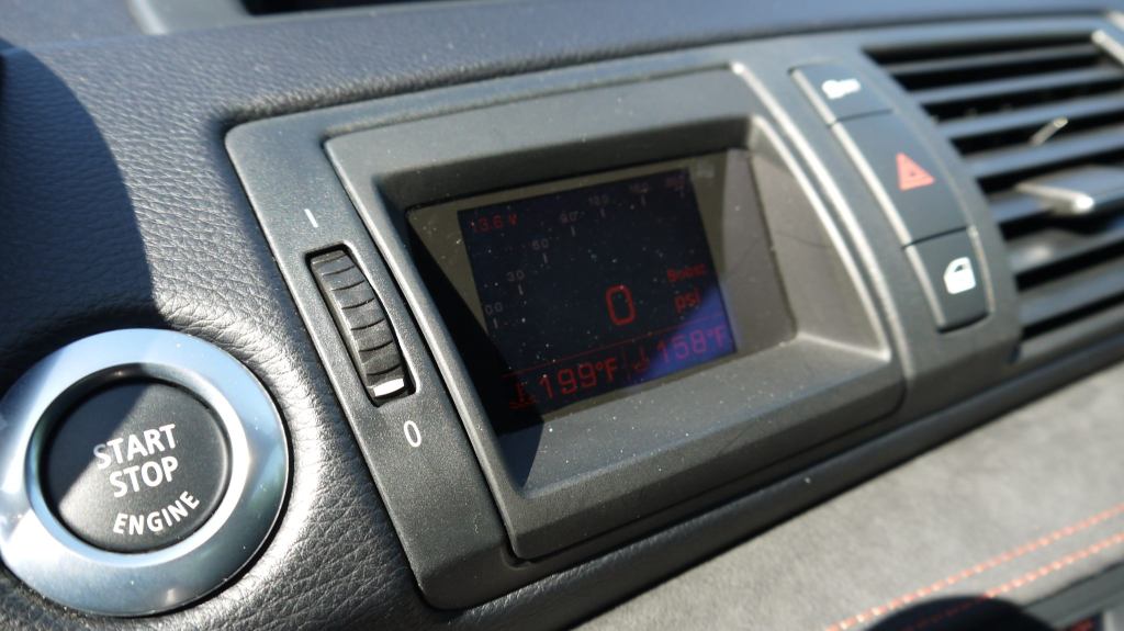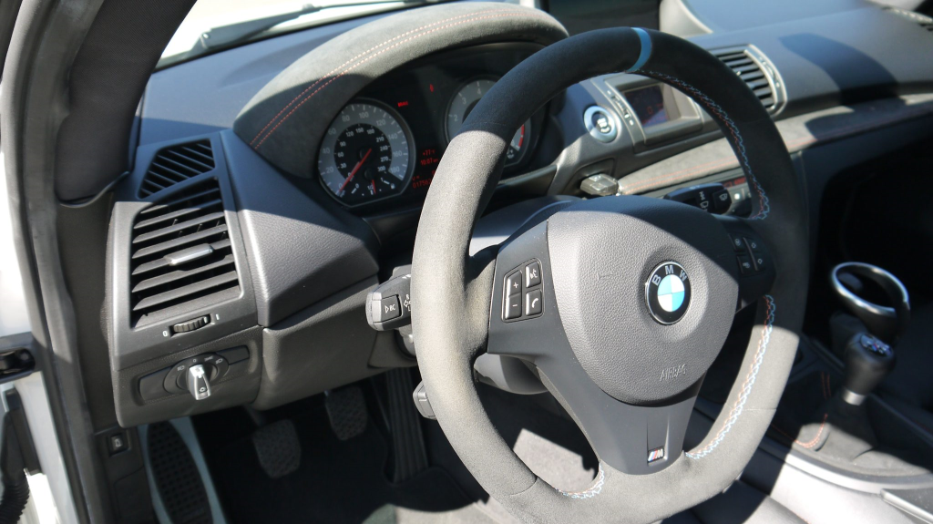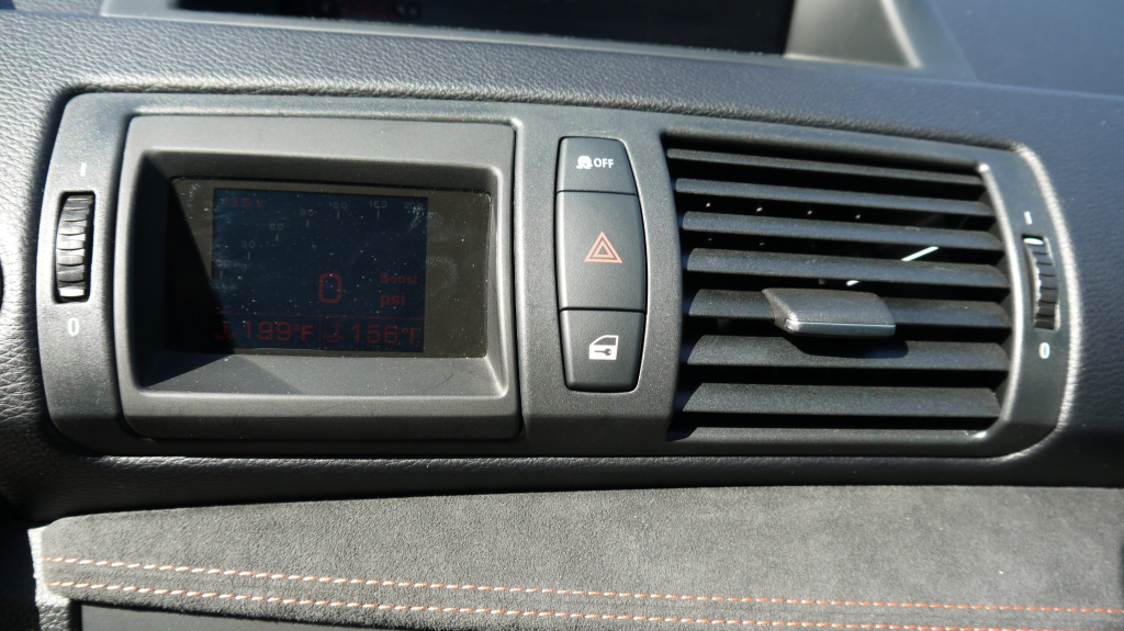 The Alcantara-wrapped flat-bottom M steering wheel features tri-color stitching and frames a 180-mph speedometer and a tachometer with a 7k-rpm redline as well as gauges for fuel level and oil temperature. An Awron digital gauge display is housed in the left vent above the center stack. The digital odometer indicates 18k miles, approximately 1k of which were added under current ownership.