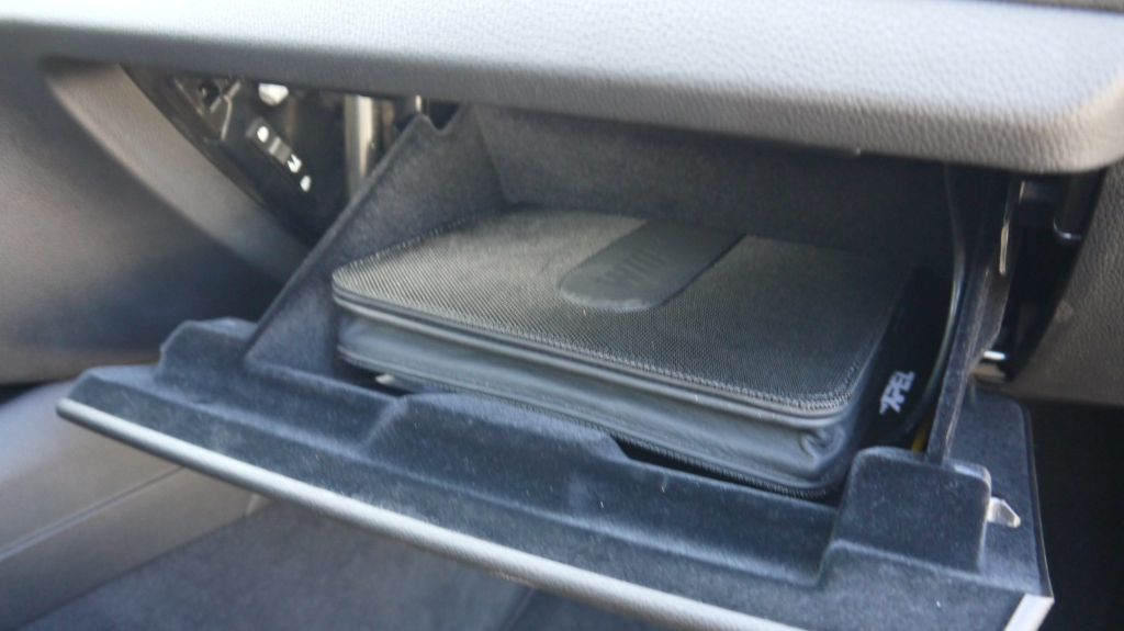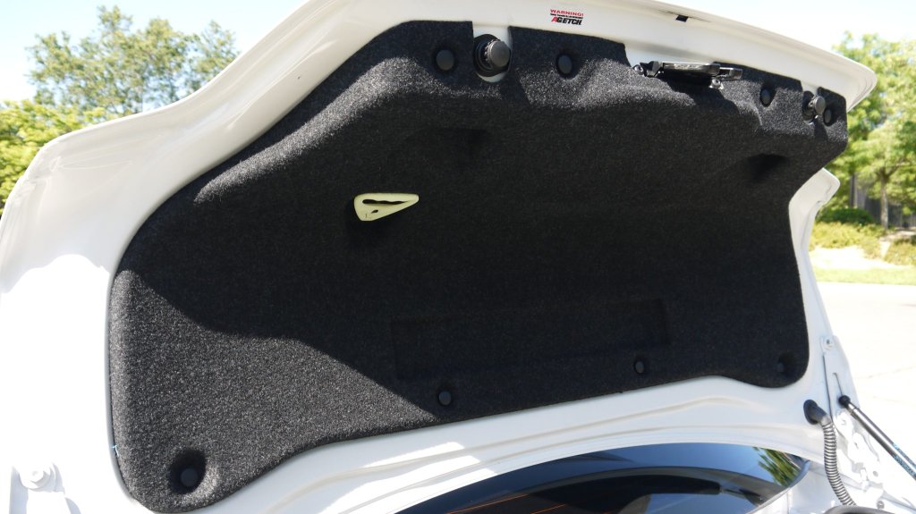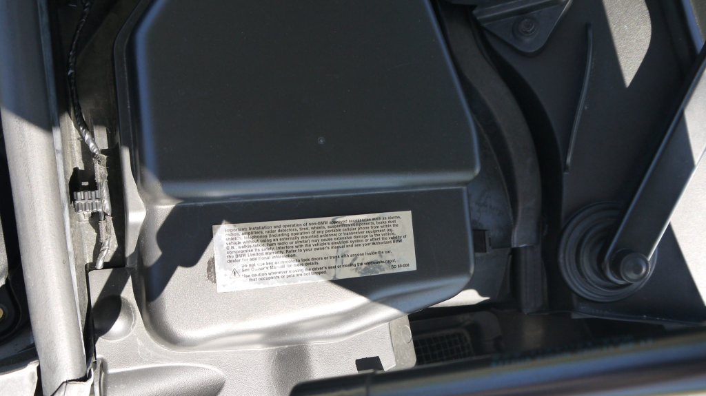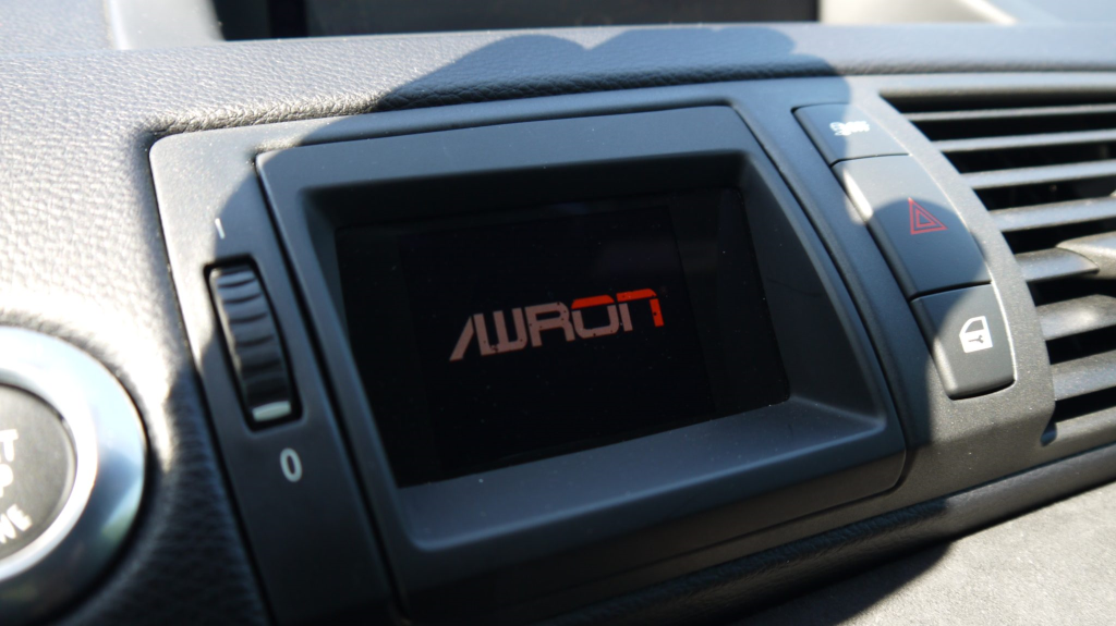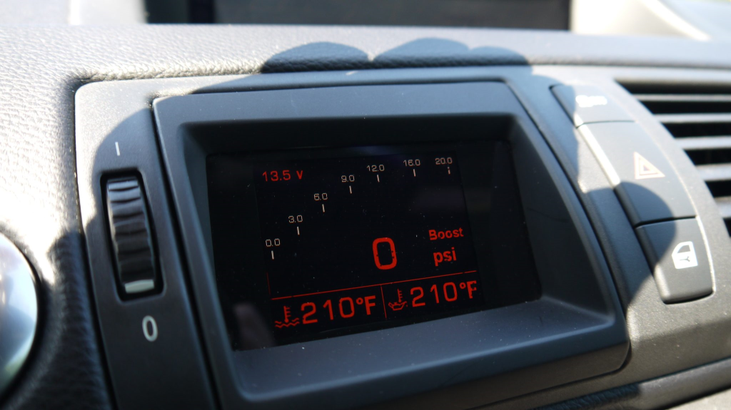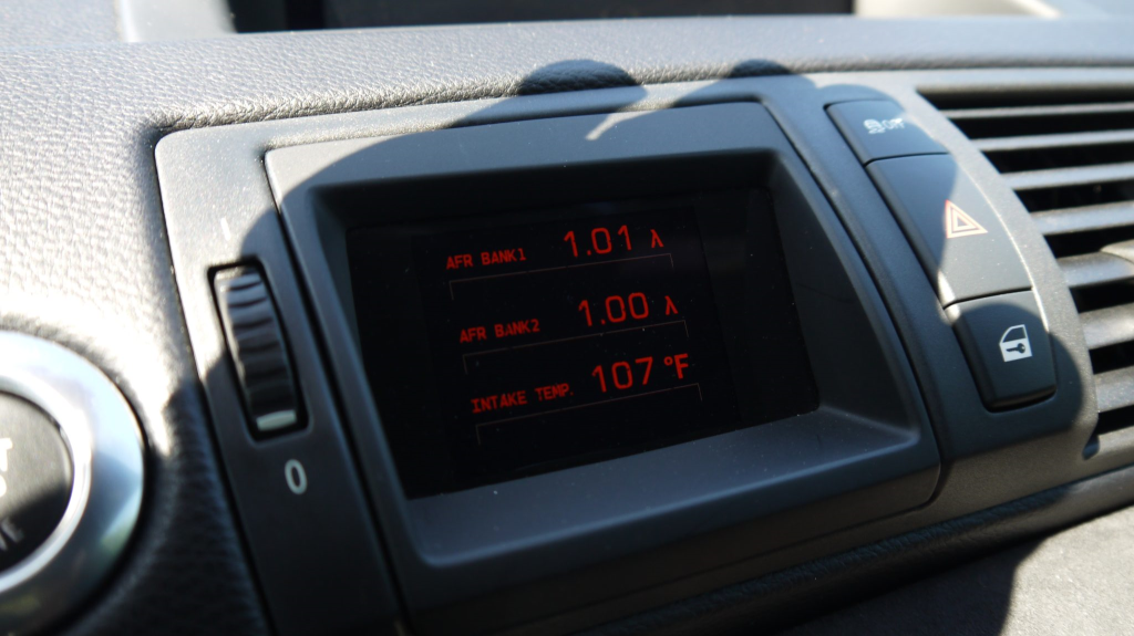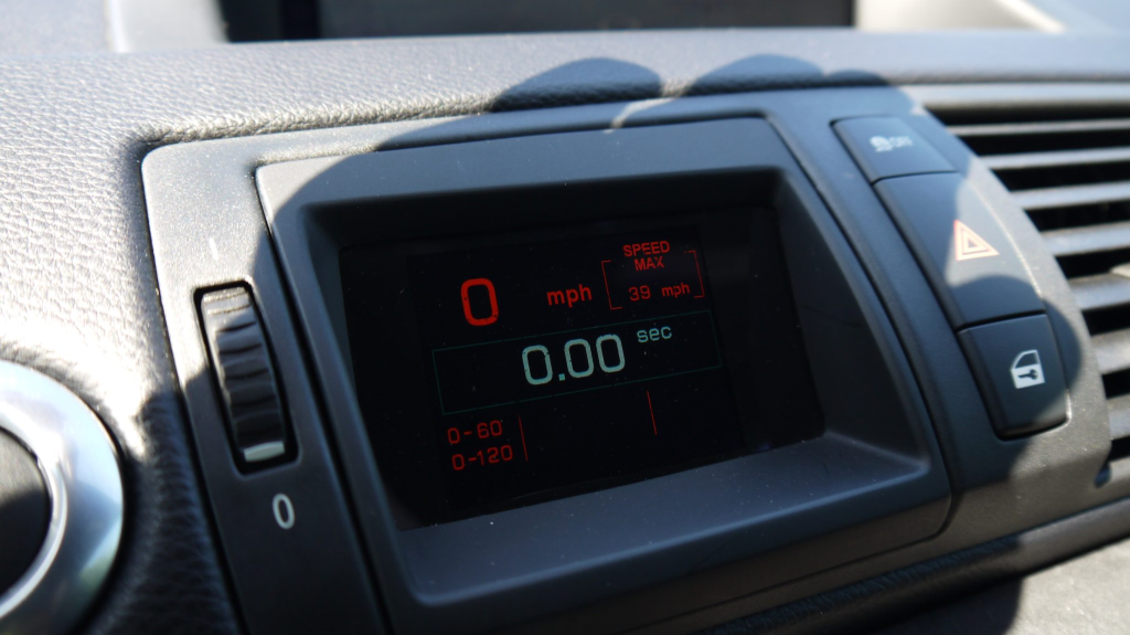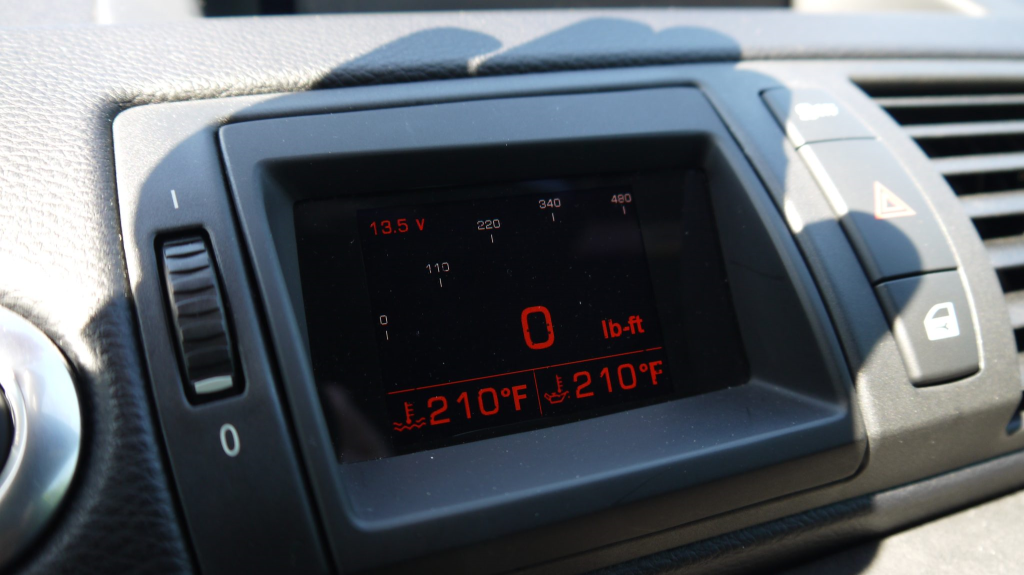 The Alcantara-wrapped flat-bottom M steering wheel features tri-color stitching and frames a 180-mph speedometer and a tachometer with a 7k-rpm redline as well as gauges for fuel level and oil temperature. An Awron digital gauge display is housed in the left vent above the center stack. The digital odometer indicates 18k miles, approximately 1k of which were added under current ownership.