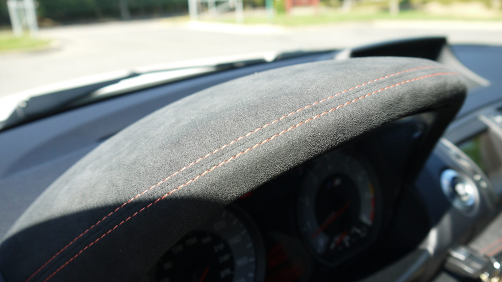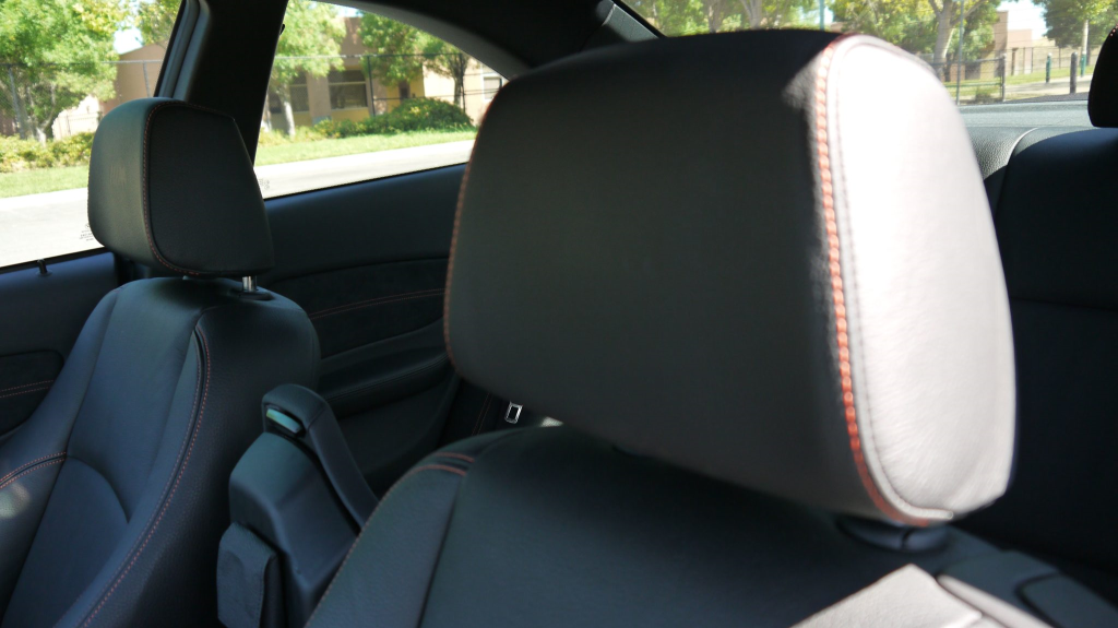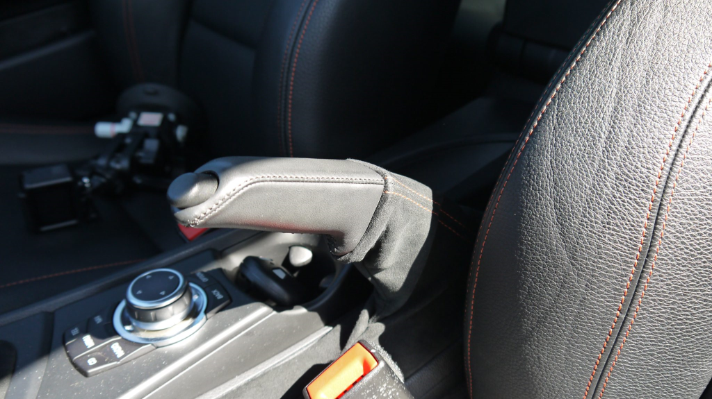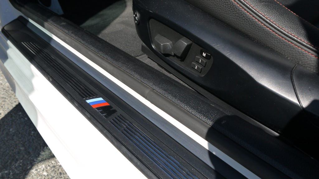 The heated power-adjustable front sport seats and split-folding rear bench are upholstered in black Boston leather with orange contrast stitching. Alcantara upholstery accents the shift boot, coin cover, doors, and dashboard, and additional appointments include Comfort Access, dual-zone automatic climate control, a CD stereo, navigation, and an iDrive infotainment system linked to a Harman Kardon sound system.