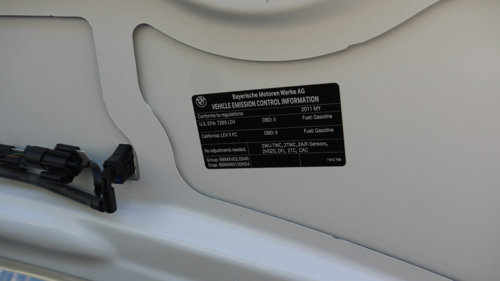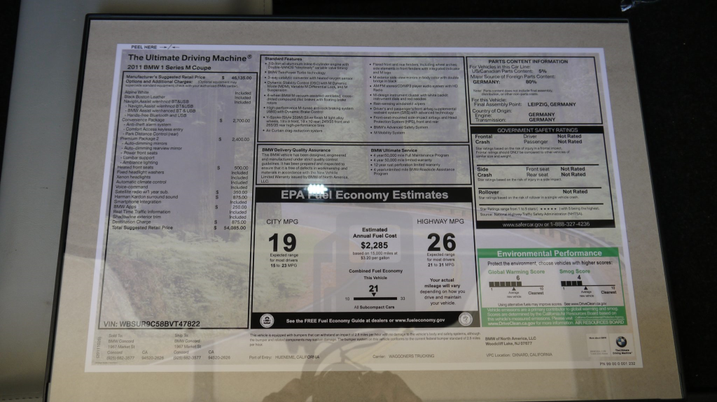 The window sticker lists initial delivery to BMW Concord in California along with factory colors, standard and optional equipment, and a total suggested retail price of $54,085.