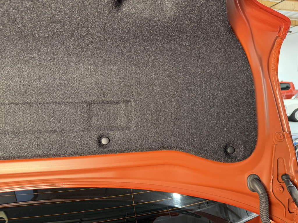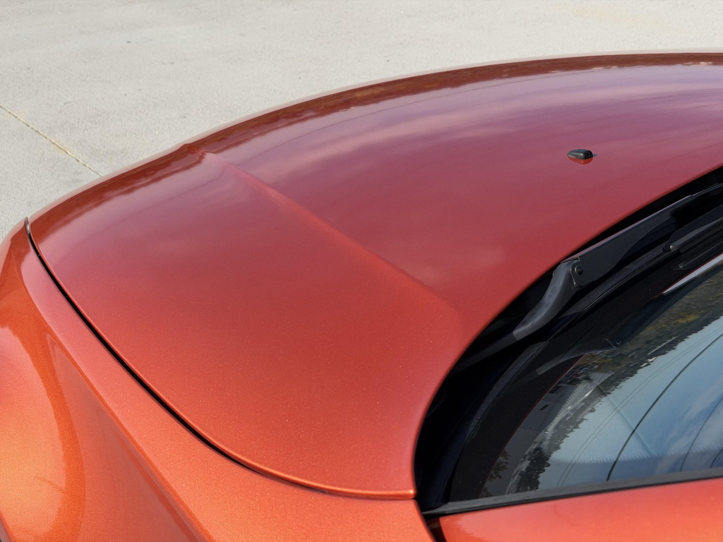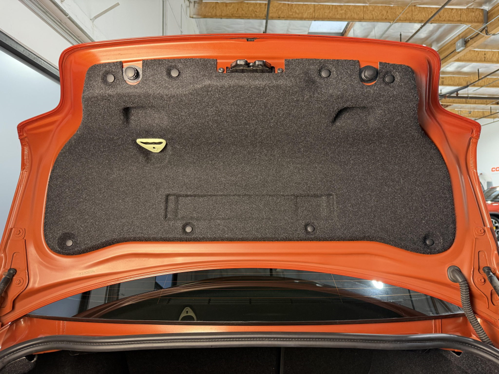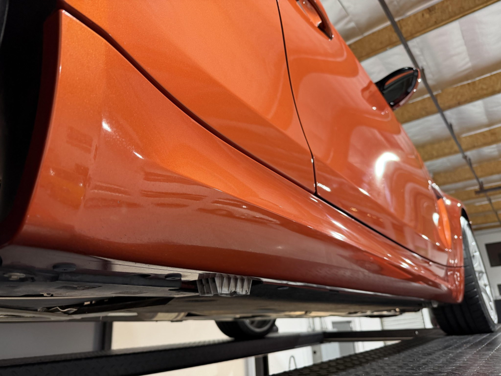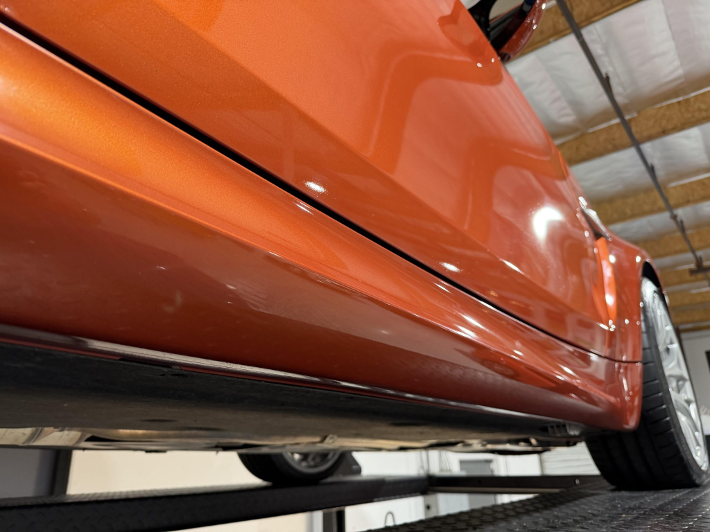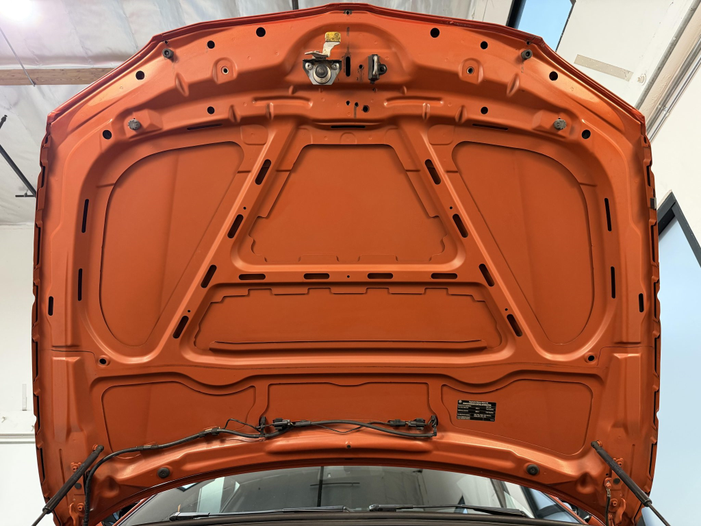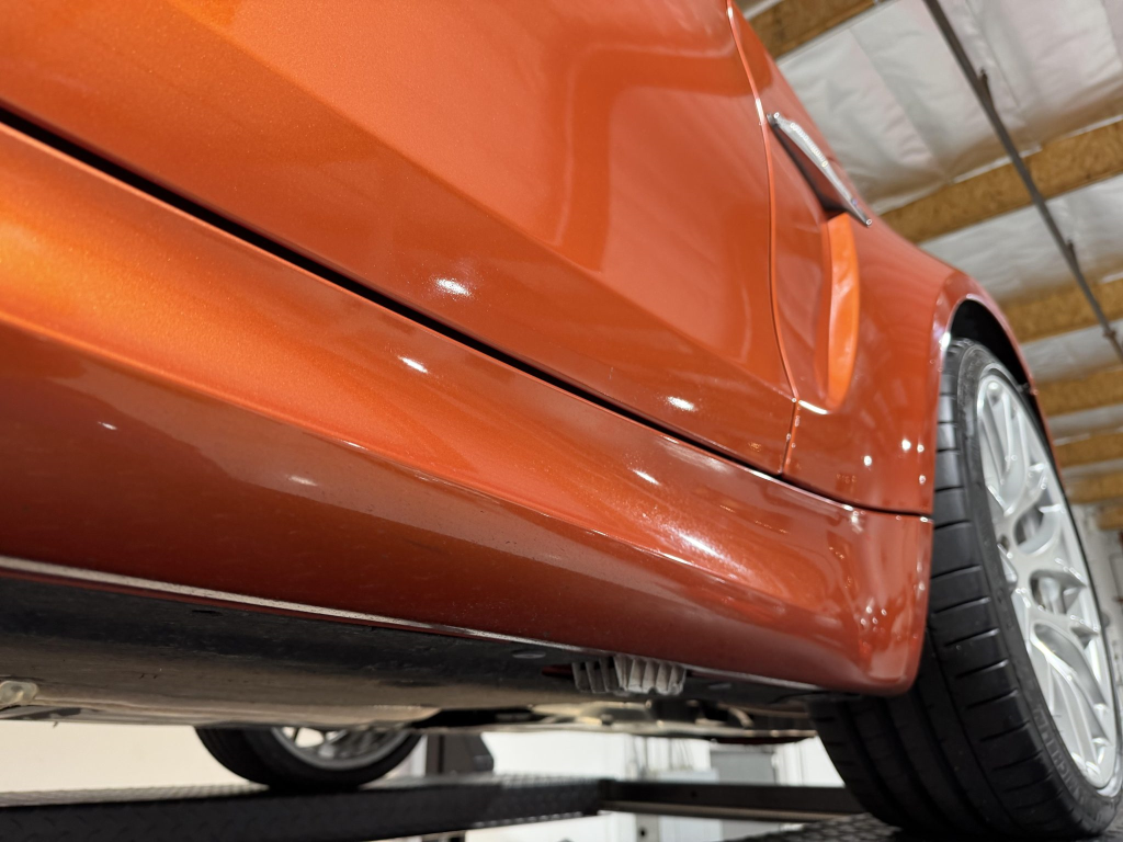 This example is one of 435 cars finished in Valencia Orange Metallic (B44) for the North American market, and features model-specific bumper covers, side skirts, flared fenders, and quad exhaust outlets. Additional details include xenon headlights, rain-sensing wipers, a trunk lid spoiler, and LED taillights. A January 2018 entry on the Carfax report lists “minor damage” to the front left corner, while a subsequent entry from December 2021 lists “minor damage” to the front. The bumper covers and roof are said to have been refinished, and close-up photographs of the exterior finish and trim are shown in the gallery below.