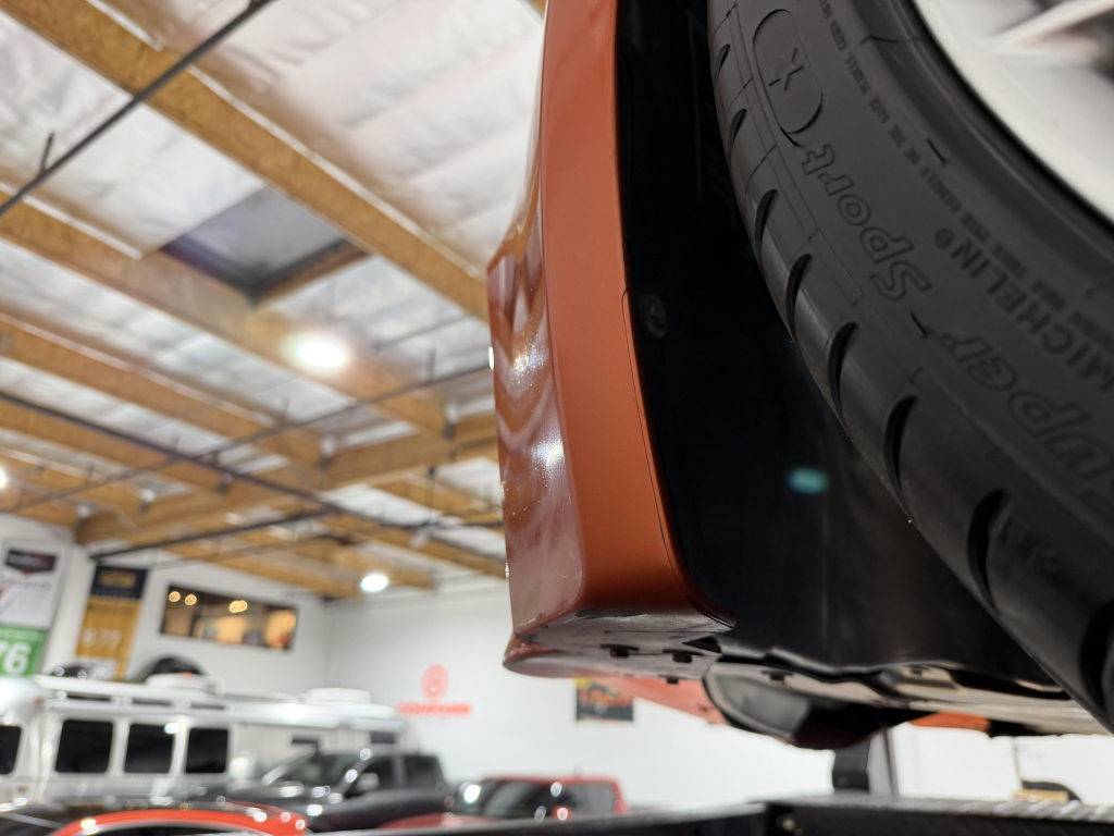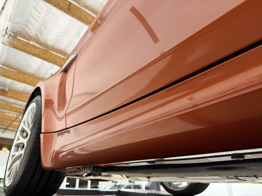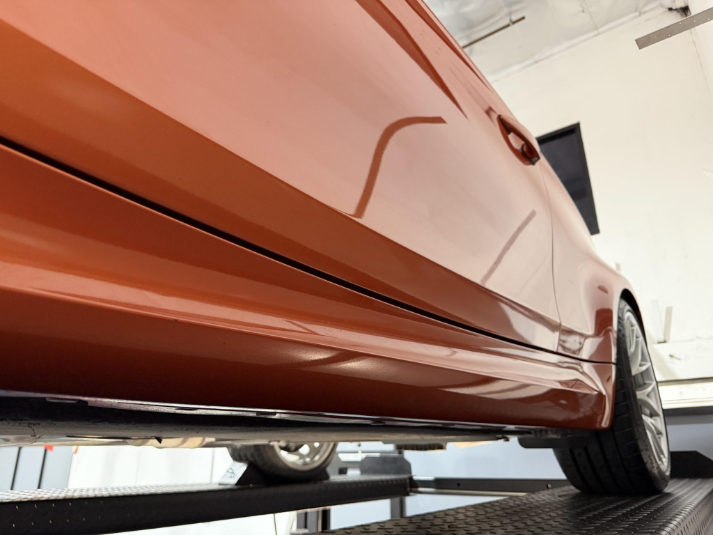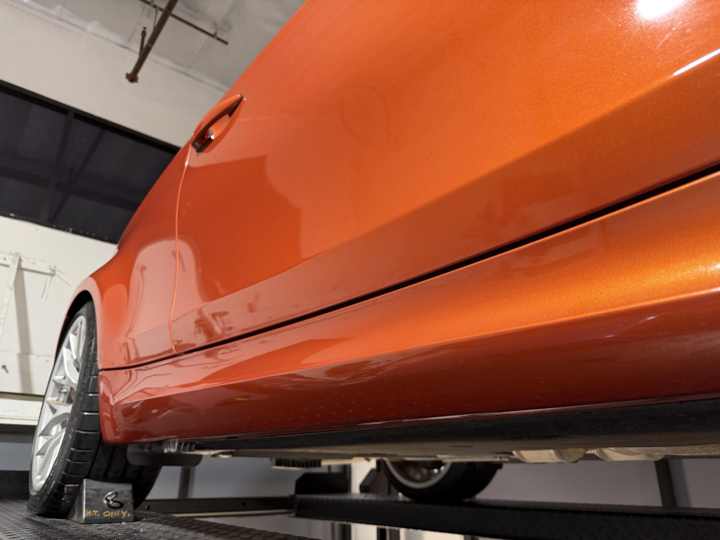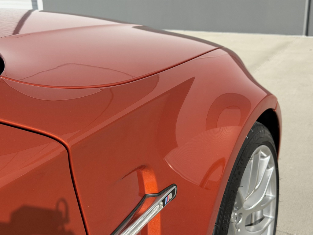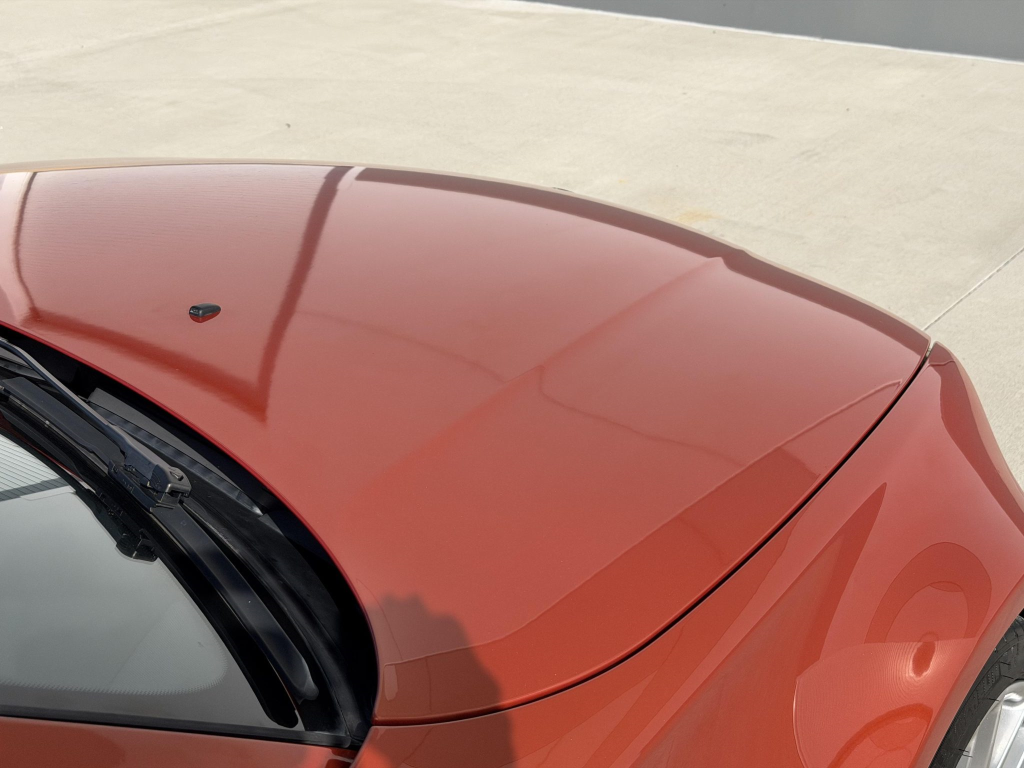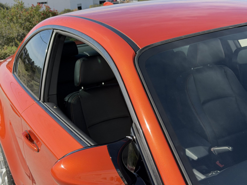 This example is one of 435 cars finished in Valencia Orange Metallic (B44) for the North American market, and features model-specific bumper covers, side skirts, flared fenders, and quad exhaust outlets. Additional details include xenon headlights, rain-sensing wipers, a trunk lid spoiler, and LED taillights. A January 2018 entry on the Carfax report lists “minor damage” to the front left corner, while a subsequent entry from December 2021 lists “minor damage” to the front. The bumper covers and roof are said to have been refinished, and close-up photographs of the exterior finish and trim are shown in the gallery below.
