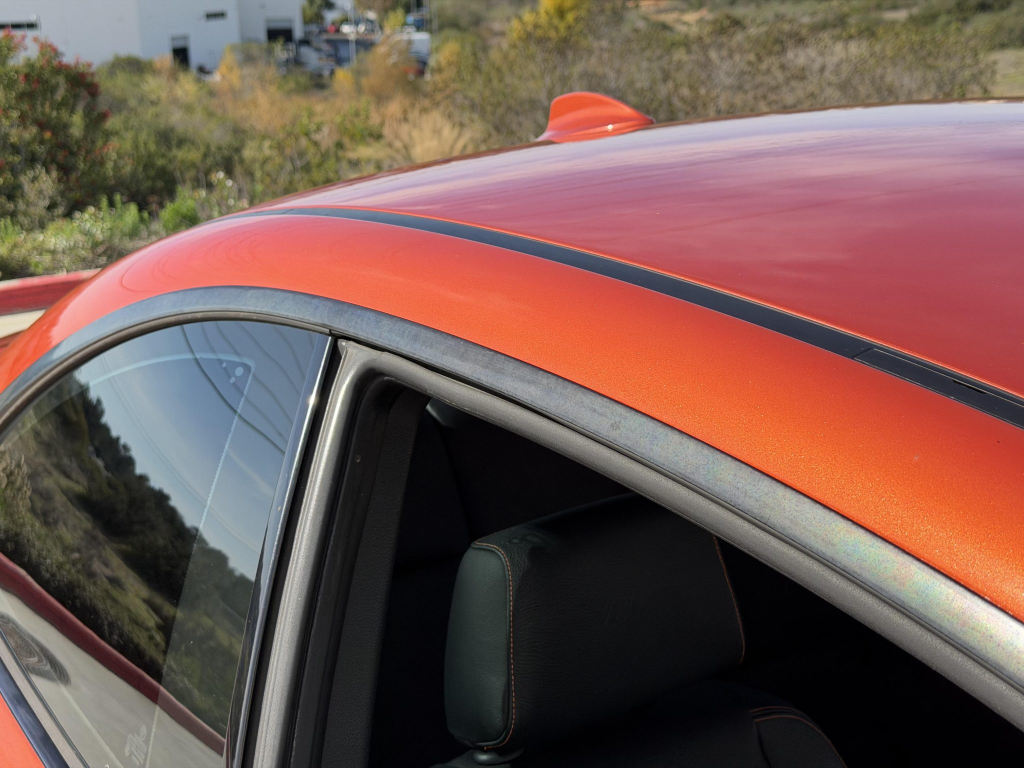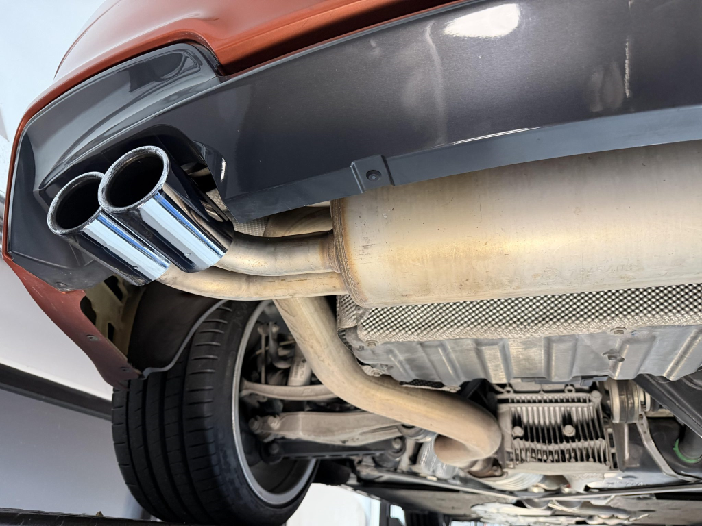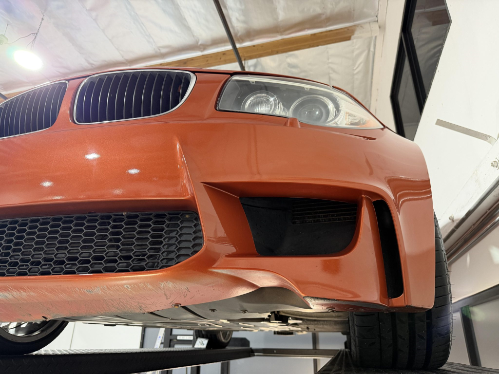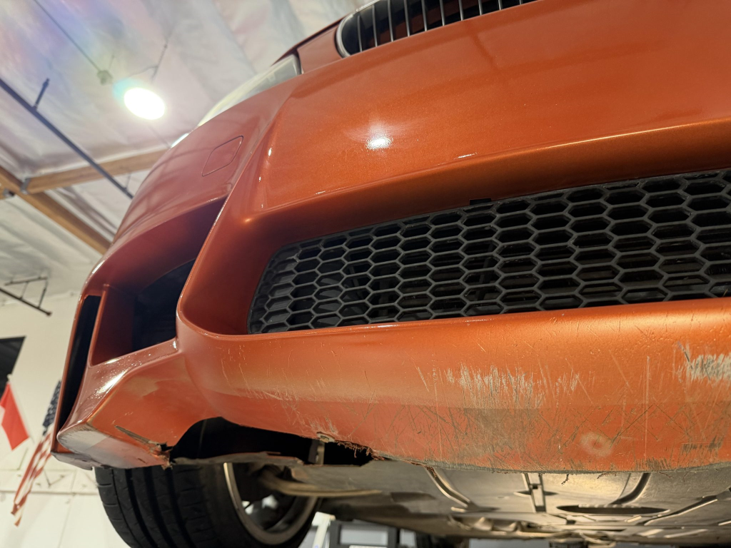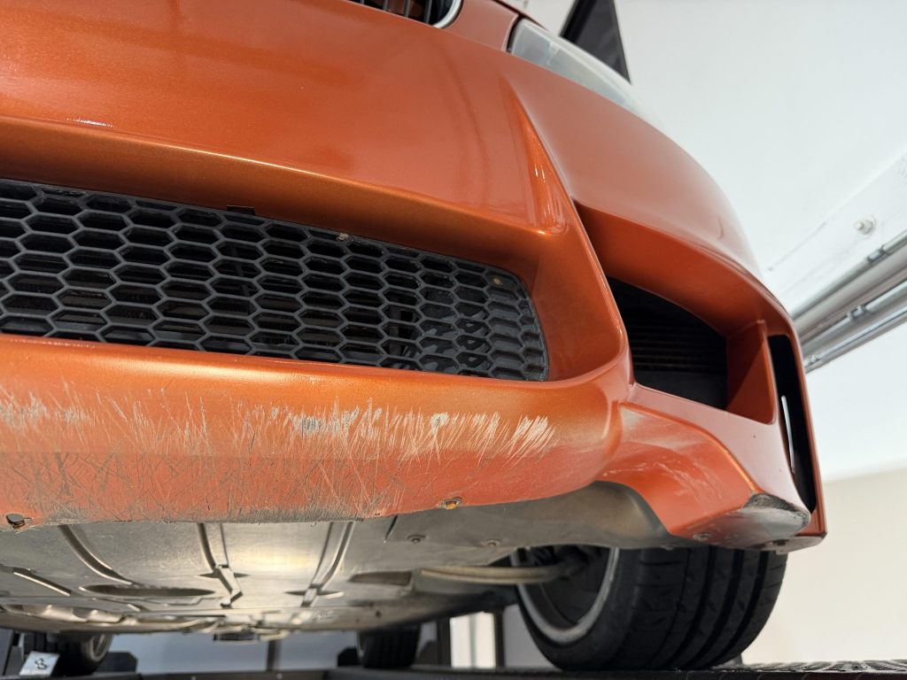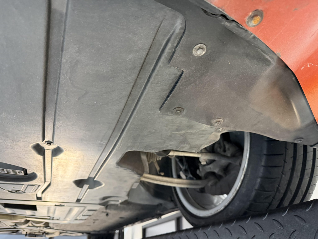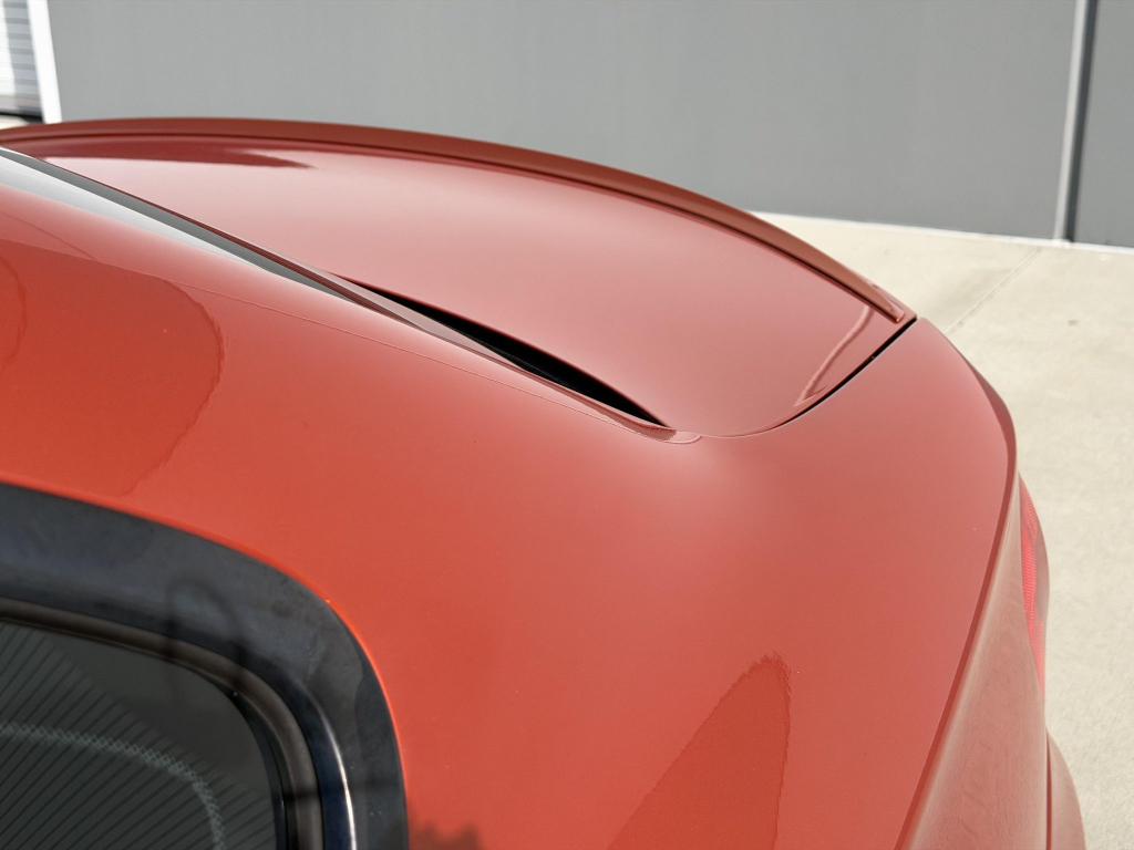 This example is one of 435 cars finished in Valencia Orange Metallic (B44) for the North American market, and features model-specific bumper covers, side skirts, flared fenders, and quad exhaust outlets. Additional details include xenon headlights, rain-sensing wipers, a trunk lid spoiler, and LED taillights. A January 2018 entry on the Carfax report lists “minor damage” to the front left corner, while a subsequent entry from December 2021 lists “minor damage” to the front. The bumper covers and roof are said to have been refinished, and close-up photographs of the exterior finish and trim are shown in the gallery below.