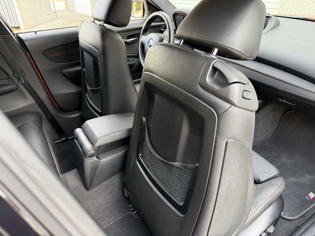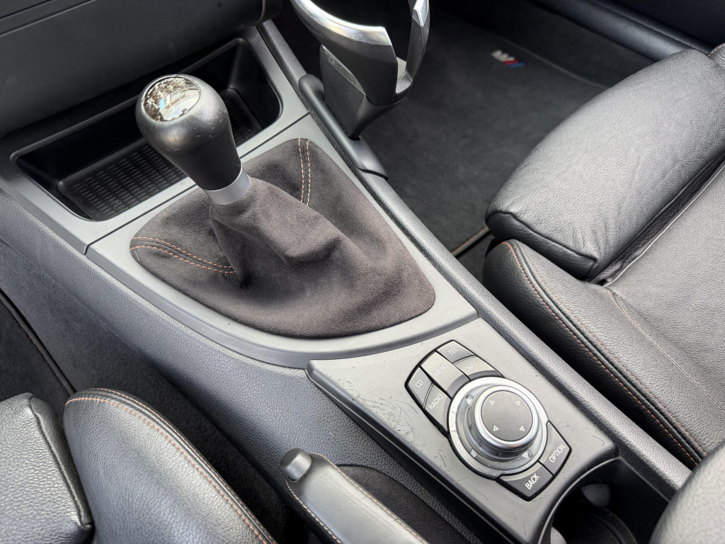 The cabin features power-adjustable front sport seats and rear bucket seats upholstered in black Boston leather with orange contrast stitching, and Alcantara upholstery accents the shift boot, doors, and dashboard. Features include iDrive infotainment with navigation, a Harman Kardon surround-sound system, a BMW Business CD stereo, an auto-dimming rearview mirror, and dual-zone automatic climate.