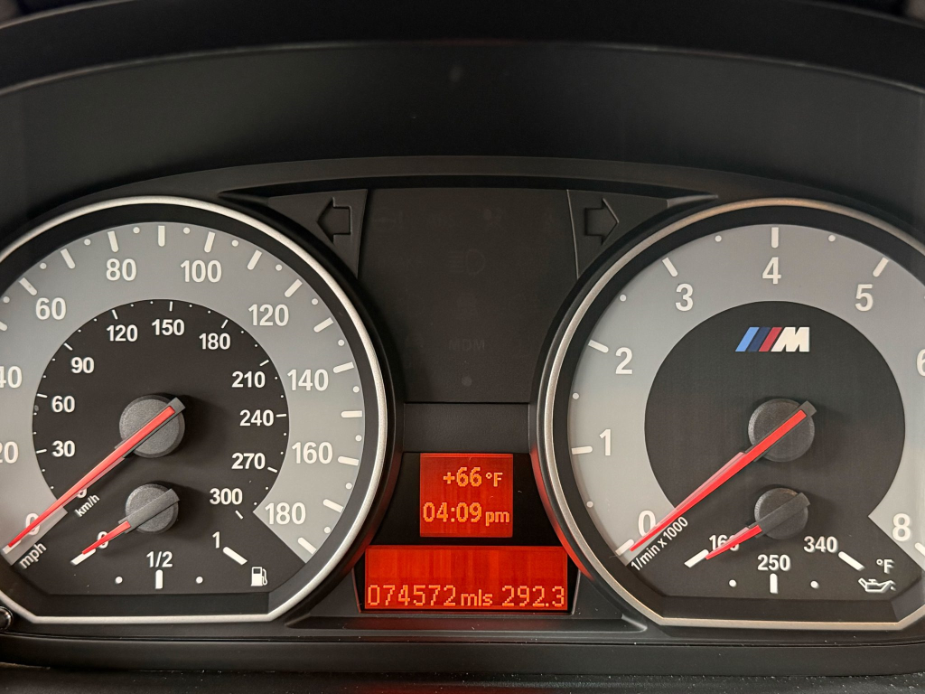 The leather-wrapped multifunction steering wheel features tri-color stitching and frames a 180-mph speedometer and a tachometer with a 7k-rpm redline, as well as gauges for fuel level and oil temperature. The digital odometer indicates 75k miles, approximately 70k of which were added under current ownership.
